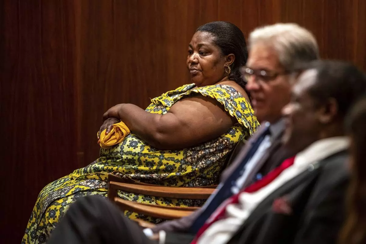 FILE - Patrick Lyoya's mother, Dorcas Lyoya, waits for the Michigan Court of Appeals hearing in the case against Christopher Schurr to begin in downtown Grand Rapids, Mich., on Wednesday, Sept. 6, 2023. (Cory Morse/MLive.com/The Grand Rapids Press via AP)