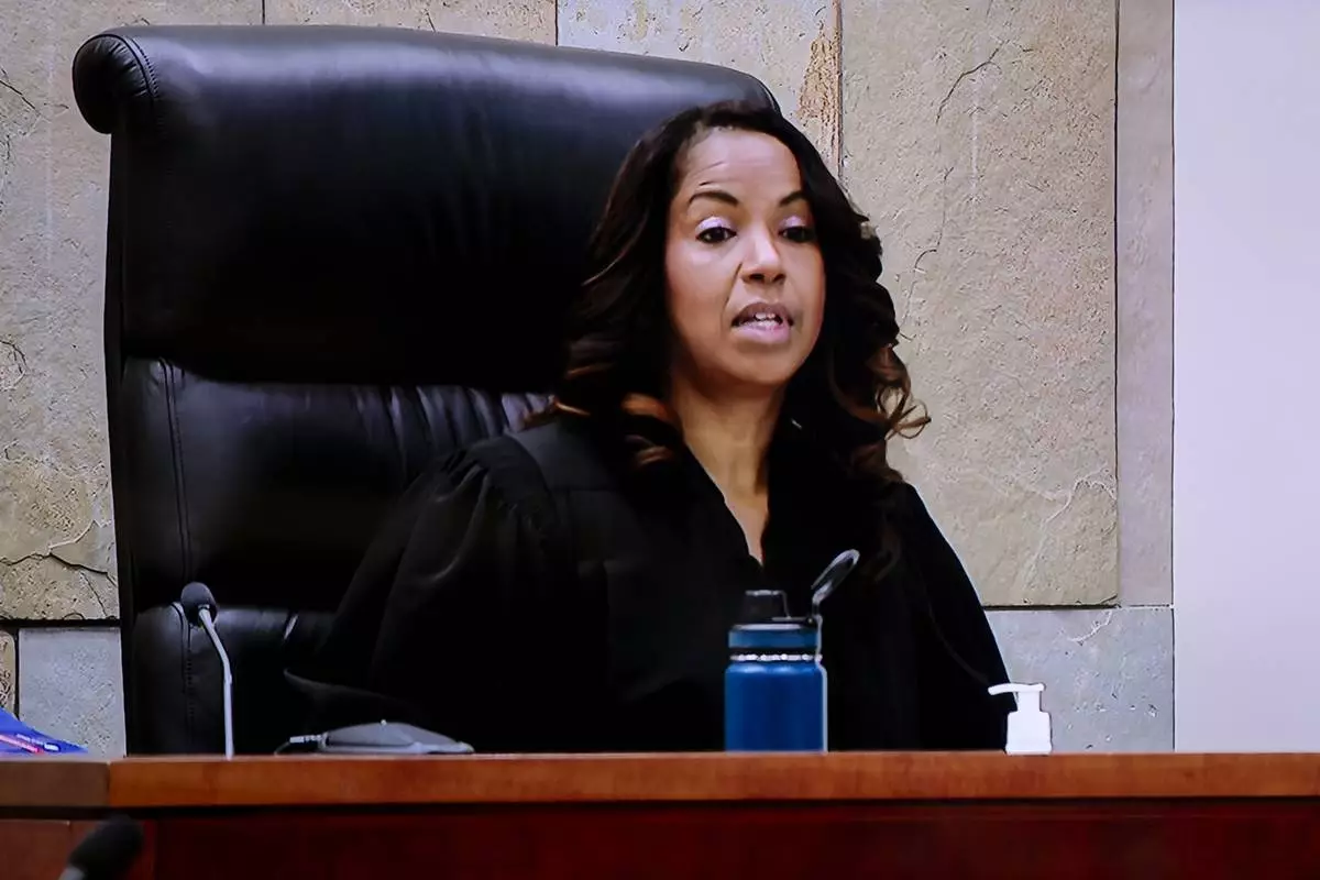 This image made from video provided by WOOD-TV shows Judge Christina Mims sitting in her courtroom at the Kent County Courthouse in Grand Rapids, Mich., on the first day of Christopher Schurr's trial, Monday, April 28, 2025. (WOOD-TV via AP, Pool)