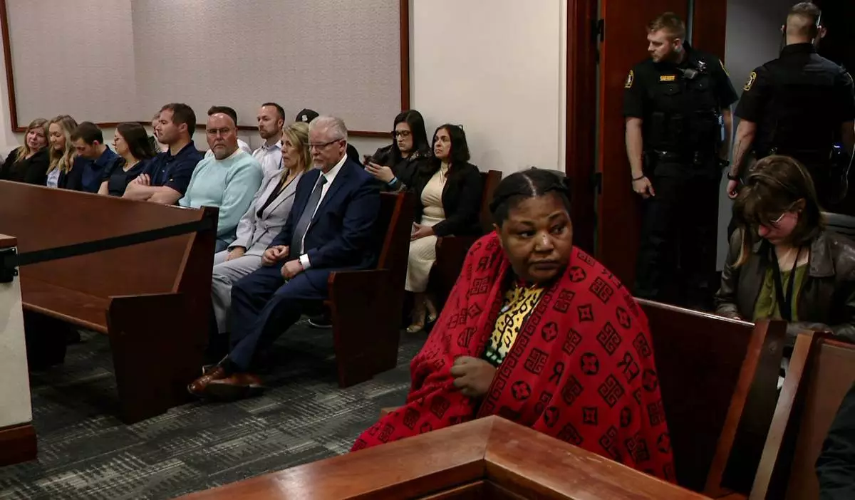 This image made from video provided by WOOD-TV shows Patrick Lyoya's mother, Dorcas, as she sits in court on the first day of Christopher Schurr's trial in the Kent County Courthouse in Grand Rapids, Mich., Monday, April 28, 2025. (WOOD-TV via AP, Pool)