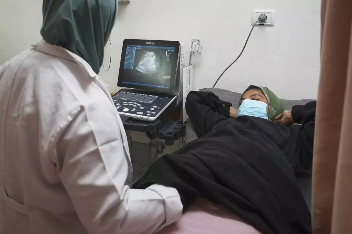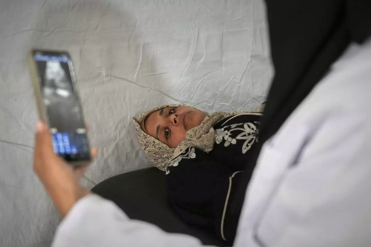 Islam Sheih Al-Eid, 27, who is six months pregnant, undergoes an ultrasound scan at the Médecins Sans Frontières (MSF) clinic in Muwasi, near Khan Younis in the southern Gaza Strip, Wednesday, April 9, 2025. (AP Photo/Abdel Kareem Hana)