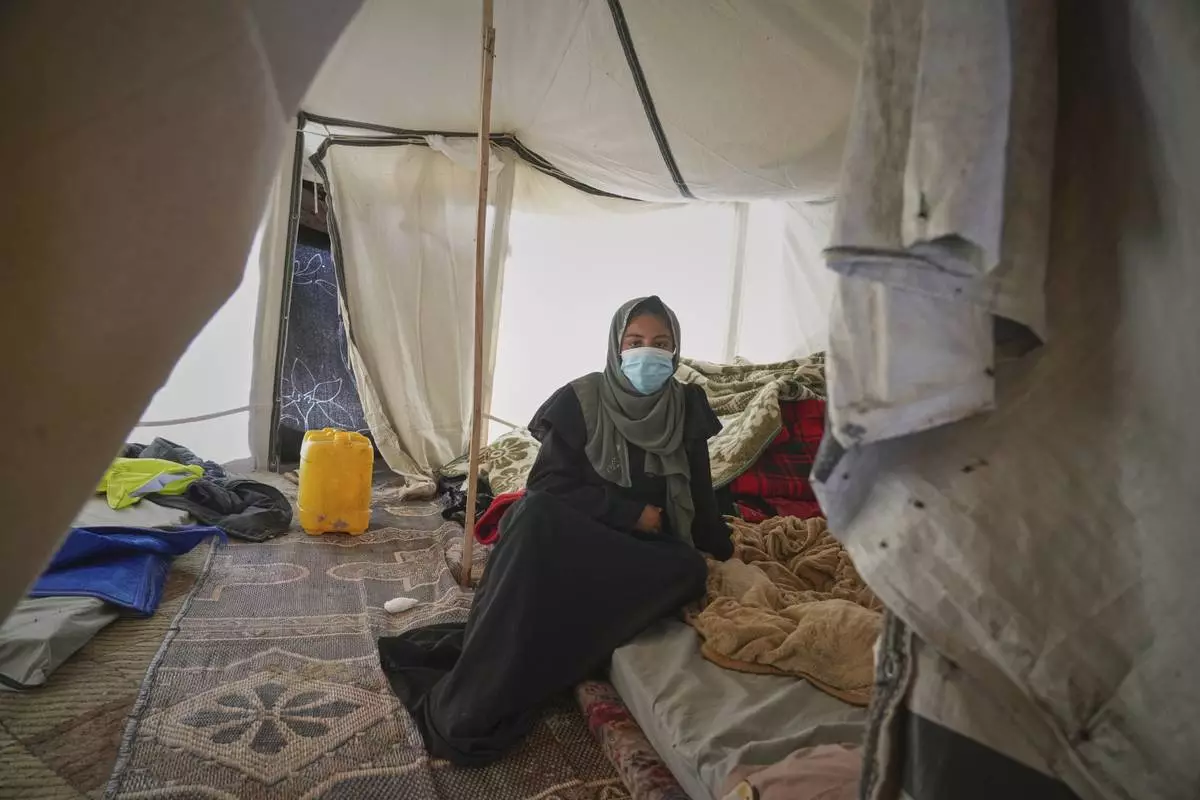 Palestinian woman Yasmine Siam, who was pregnant but suffered a miscarriage a few days later, poses for a photo in her tent in Khan Younis, southern Gaza Strip, Wednesday, April 9, 2025. (AP Photo/Abdel Kareem Hana)