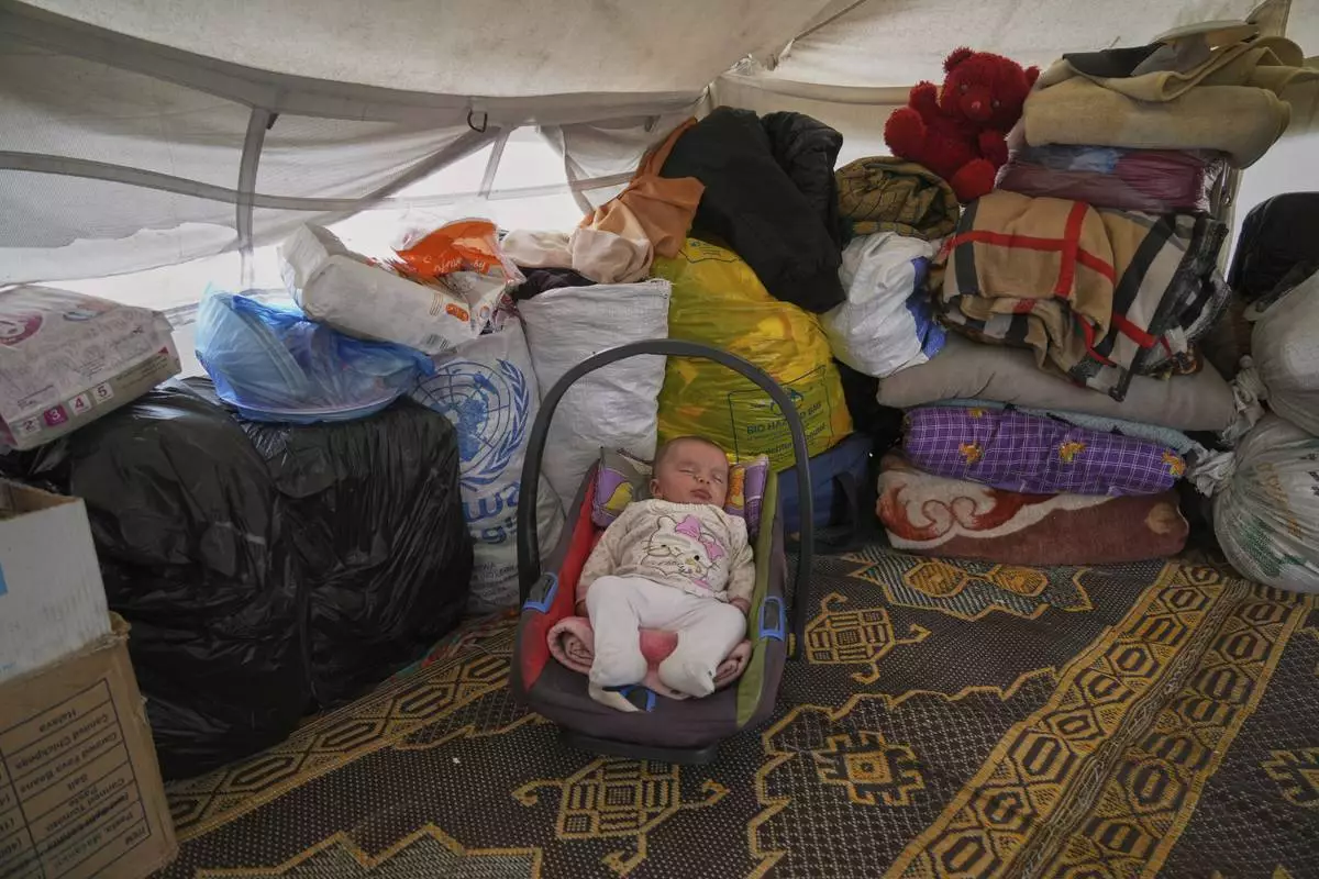 3-month-old, Jilan Zarrouk sleeps at a makeshift tent camp for displaced Palestinians in Muwasi, outskirts of Khan Younis in the southern Gaza Strip, Wednesday, April 9, 2025. (AP Photo/Abdel Kareem Hana)