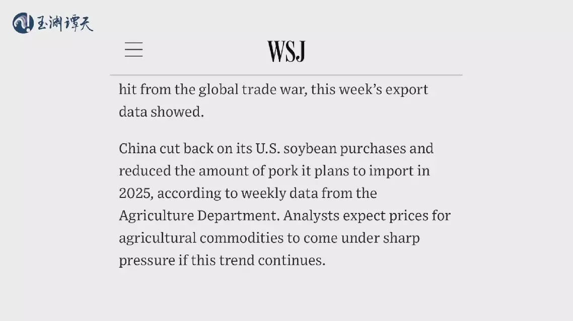 Yuyuan Tantian, a new media arm of the China Media Group (CMG), cited a Wall Street Journal report based on the weekly data from the U.S. Department of Agriculture as saying that China has cut back on its soybean imports from the United States and reduced the amount of pork it plans to import from the United States in 2025.