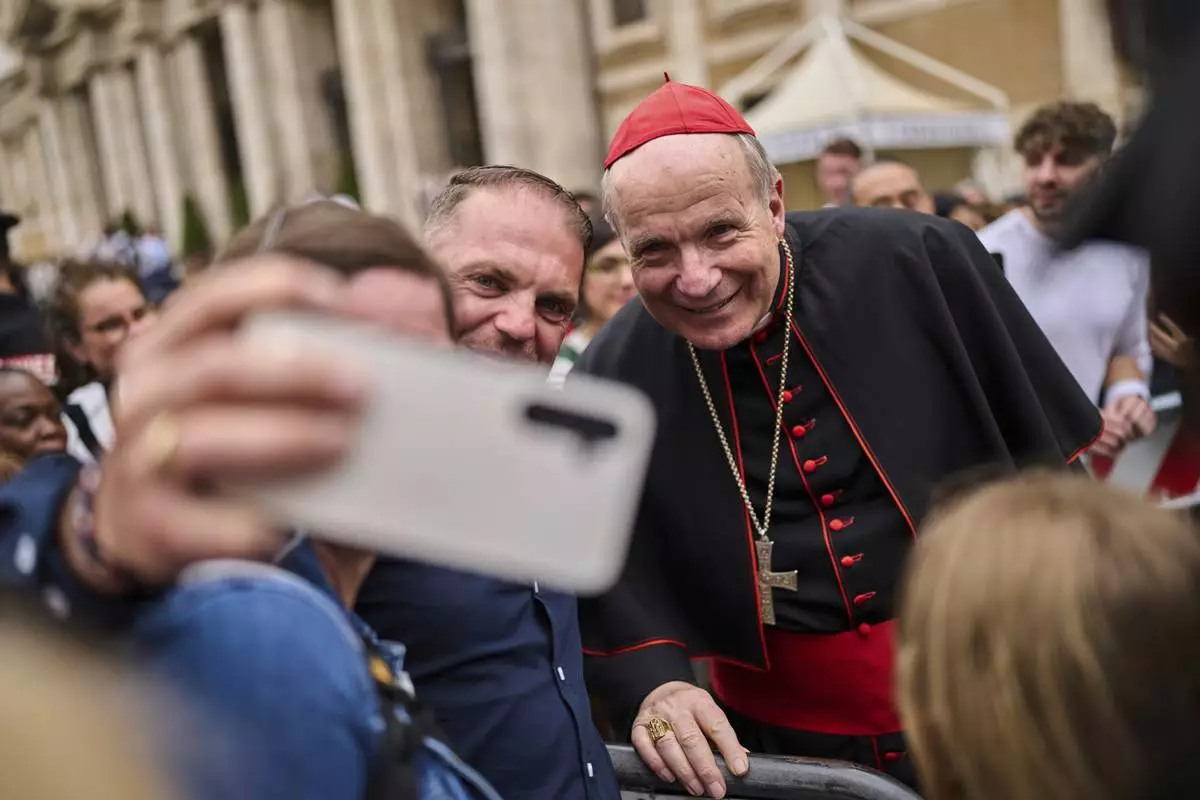 Cardinal Christoph Schönborn poses for selfie photos with people outside St. Mary Major Basilica in Rome, Sunday, April 27, 2025. (AP Photo/Bernat Armangue)