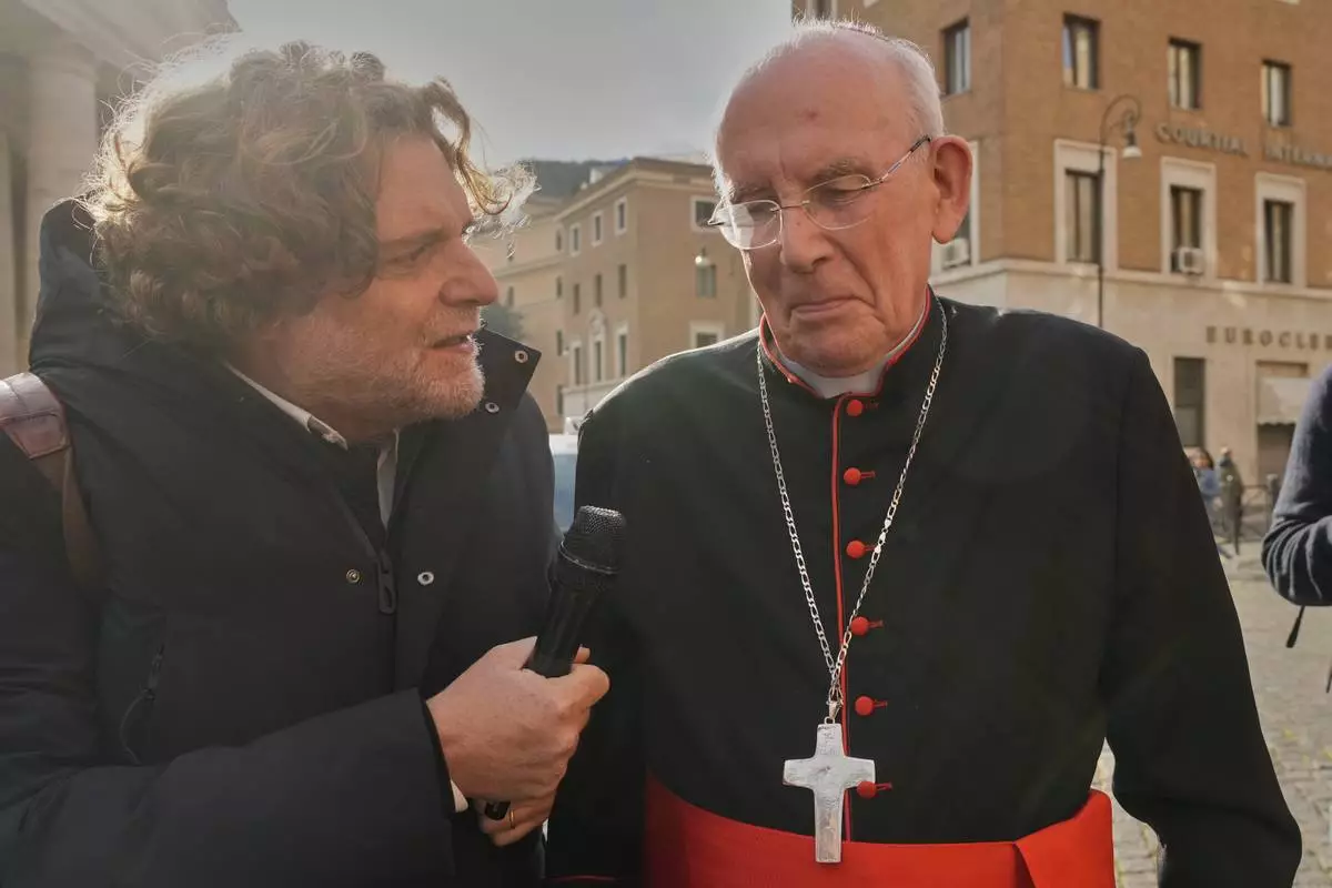 Argentine Cardinal Ángel Sixto Rossi speaks to reporters as he arrives for a college of cardinals' meeting, at the Vatican, Monday, April 28, 2025. (AP Photo/Gregorio Borgia)