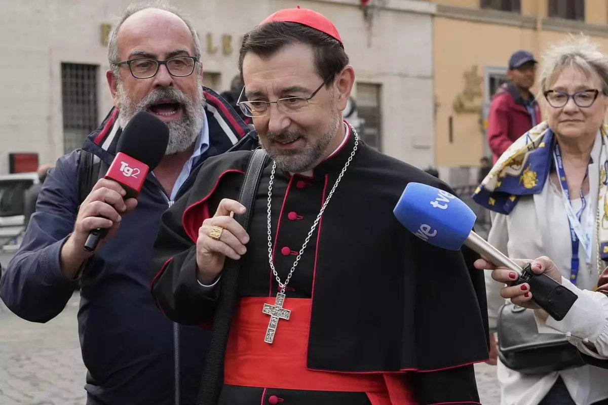 Cardinal José Cobo Cano is approached by reporters as he arrives for a college of cardinals' meeting, at the Vatican, Monday, April 28, 2025. (AP Photo/Gregorio Borgia)