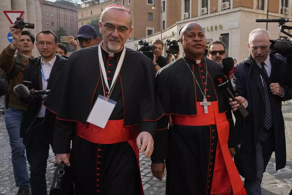 Cardinal Pierbattista Pizzaballa, left, and Cardinal Fridolin Ambongo Besungu arrive for a college of cardinals' meeting, at the Vatican, Monday, April 28, 2025. (AP Photo/Gregorio Borgia)