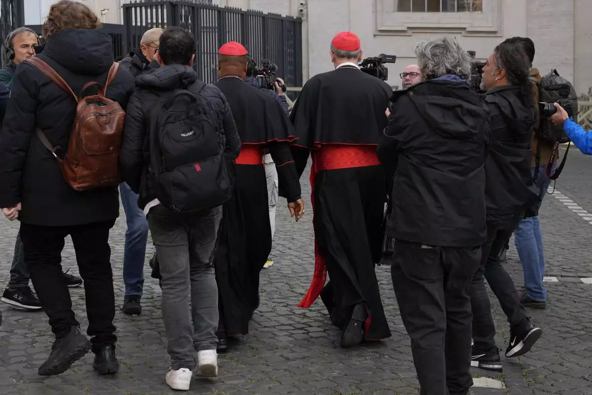 Cardinal Pierbattista Pizzaballa, center right, and Cardinal Fridolin Ambongo Besungu are surrounded by reporters as they arrive for a college of cardinals' meeting, at the Vatican, Monday, April 28, 2025. (AP Photo/Gregorio Borgia)