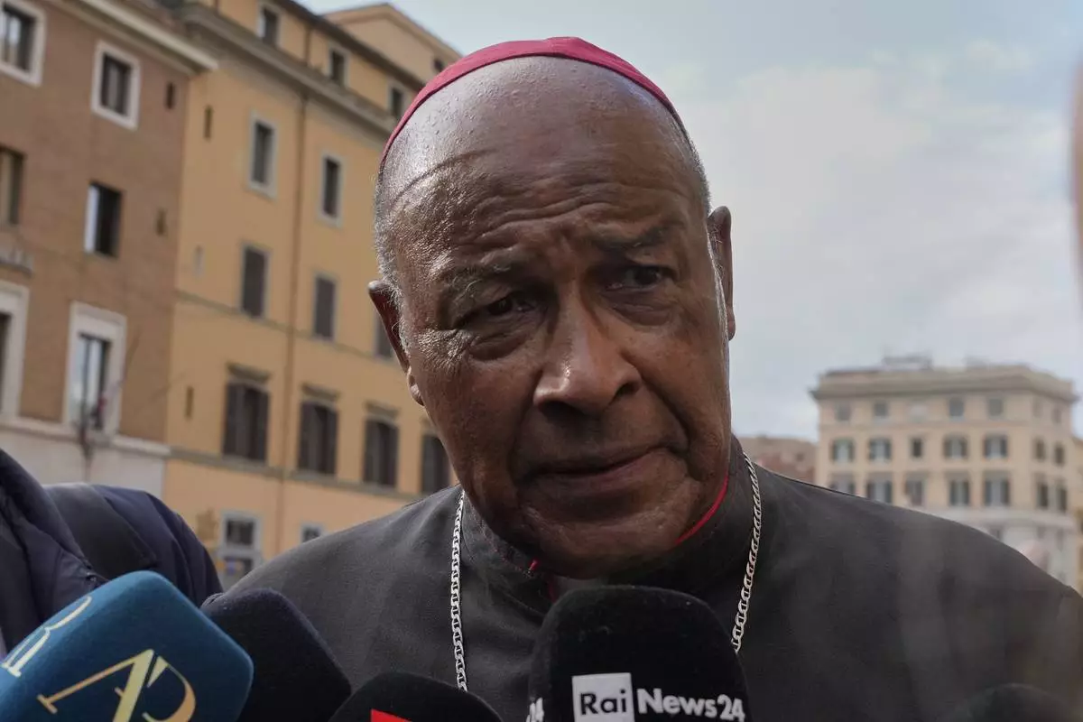 Cardinal Wilfrid Napier is approached by reporters as he arrives for a college of cardinals' meeting, at the Vatican, Monday, April 28, 2025. (AP Photo/Gregorio Borgia)