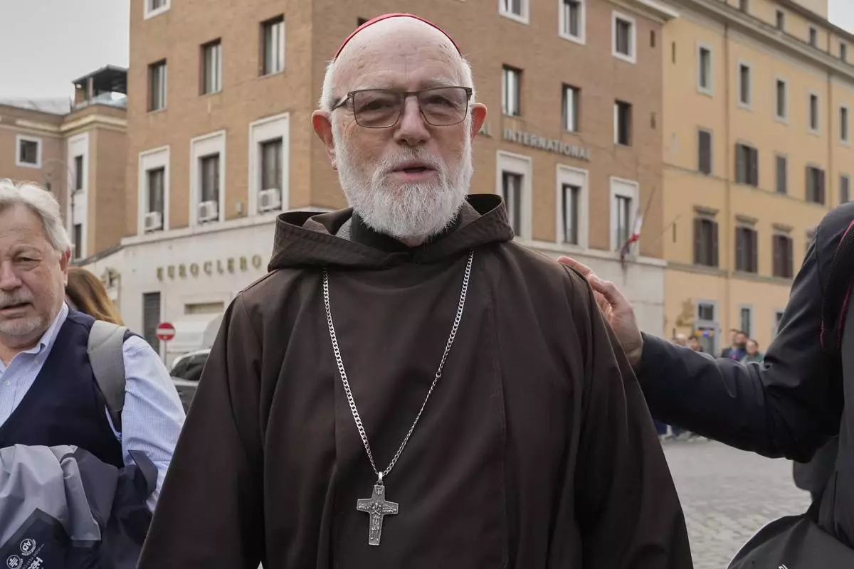 Cardinal Seán Patrick O'Malley arrives for a college of cardinals' meeting, at the Vatican, Monday, April 28, 2025. (AP Photo/Gregorio Borgia)