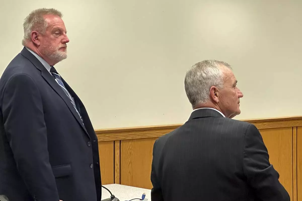 From left, Randall Hepp, former Waupun Correctional Institution warden, and his attorney Michael Steinle stand inside Dodge County Circuit Court in Jueneau, Wis., Monday, April 28, 2025, after a judge ordered Hepp to pay a $500 fine to resolve a misdemeanor charge in connection with an inmate's 2024 death. (AP Photo/Todd Richmond)