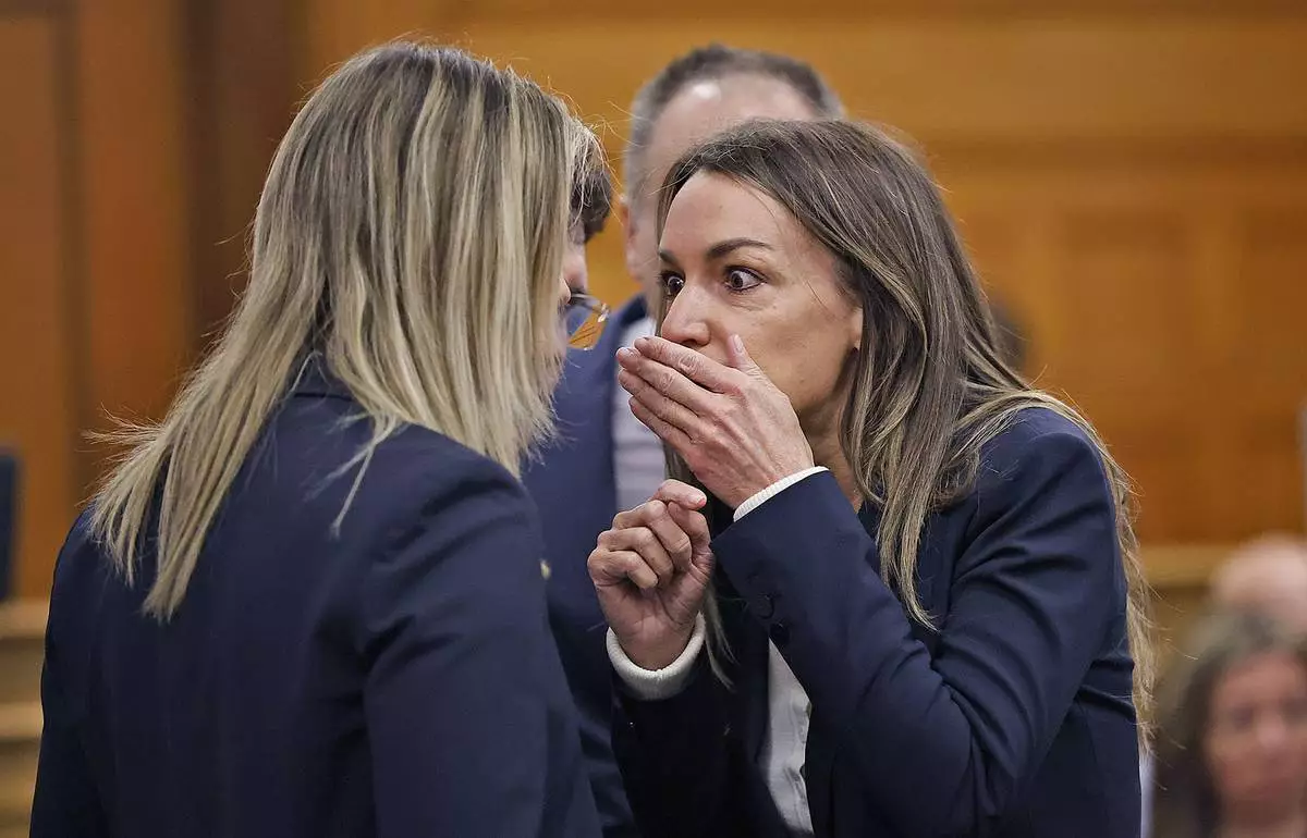 Karen Read, right, and lawyer Elizabeth Little discuss developments during Read's murder trial in Norfolk Superior Court in Dedham, Mass., Wednesday, May 21, 2025. (Greg Derr/The Patriot Ledger via AP, Pool)