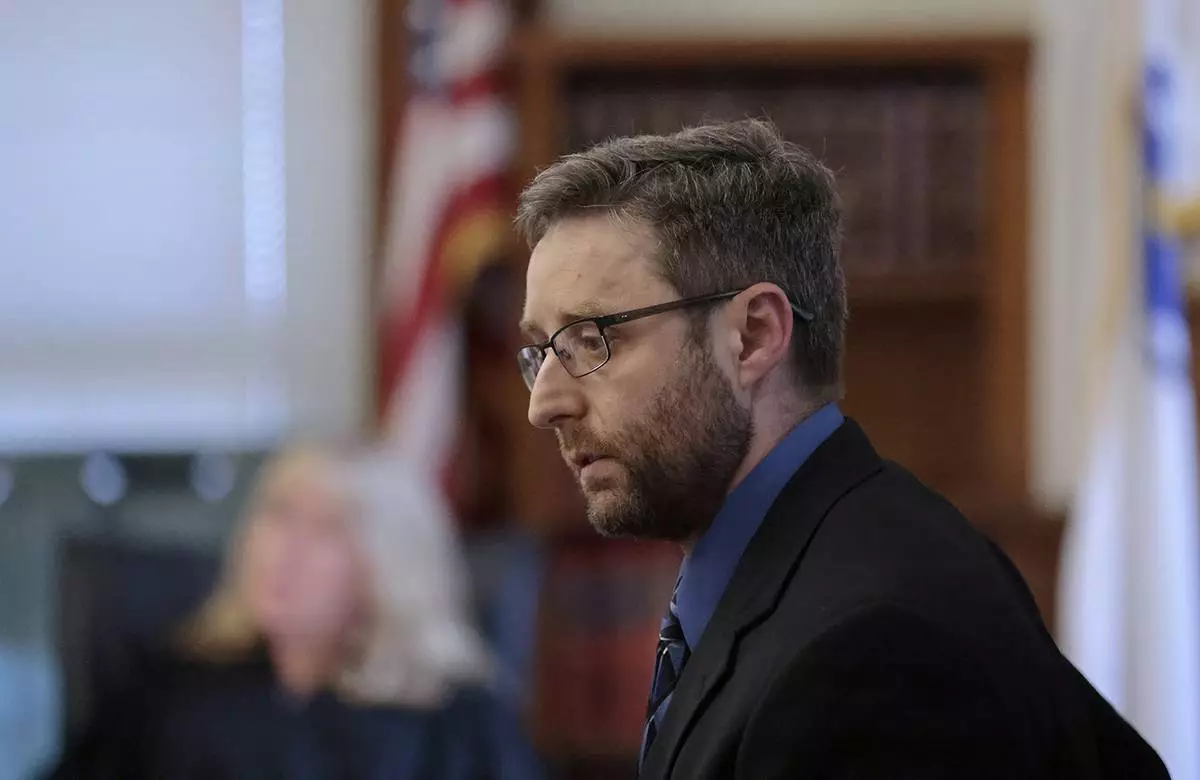 Prosecutor Adam Lally, left, calls Karl Miyasako of Bode Technology lab into the courtroom during the retrial of Karen Read in the Norfolk Superior Court, Monday, May 19, 2025, in Dedham, Mass. (Pat Greenhouse/The Boston Globe via AP, Pool)