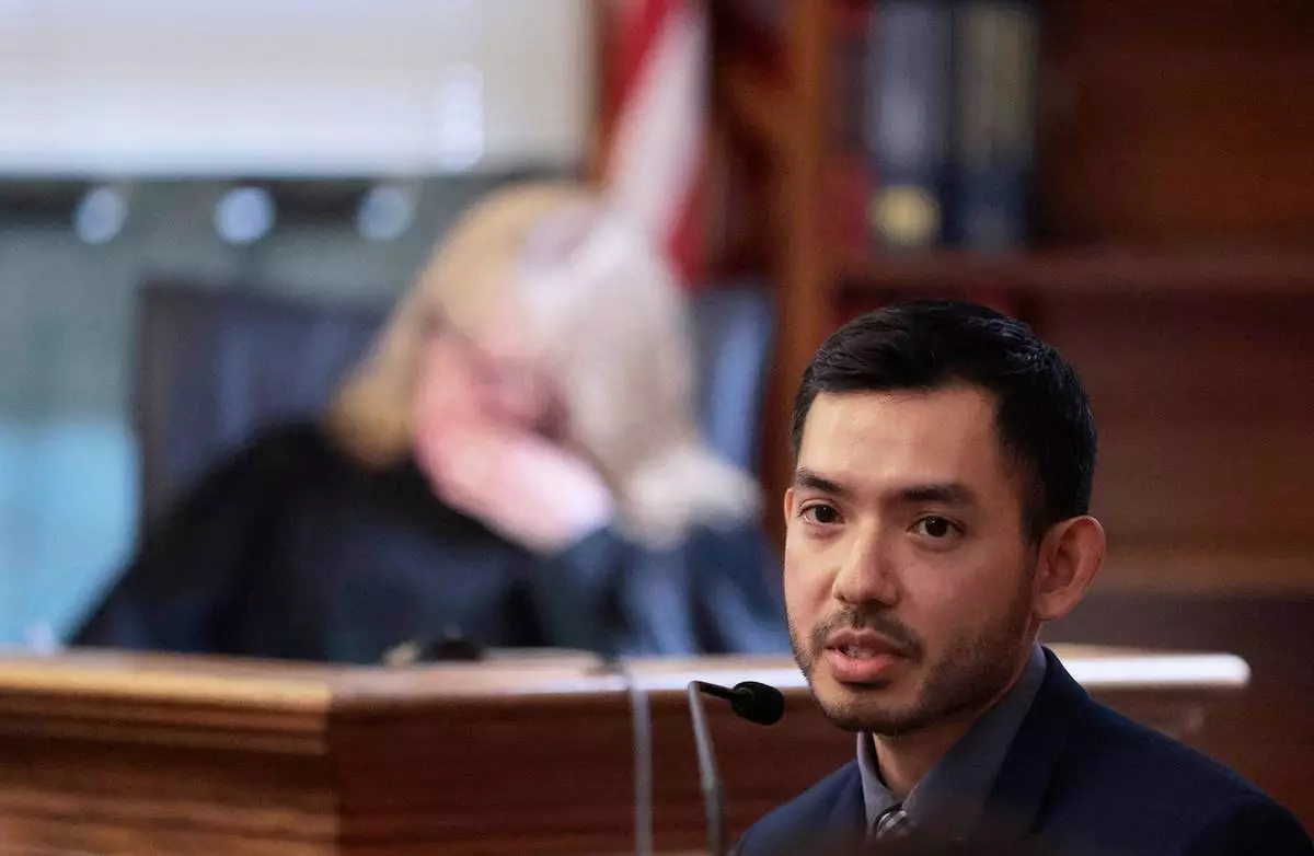 Karl Miyasako, of Bode Technology lab, testifies during the retrial of Karen Read in Norfolk Superior Court, Monday, May 19, 2025, in Dedham, Mass. (Pat Greenhouse/The Boston Globe via AP, Pool)