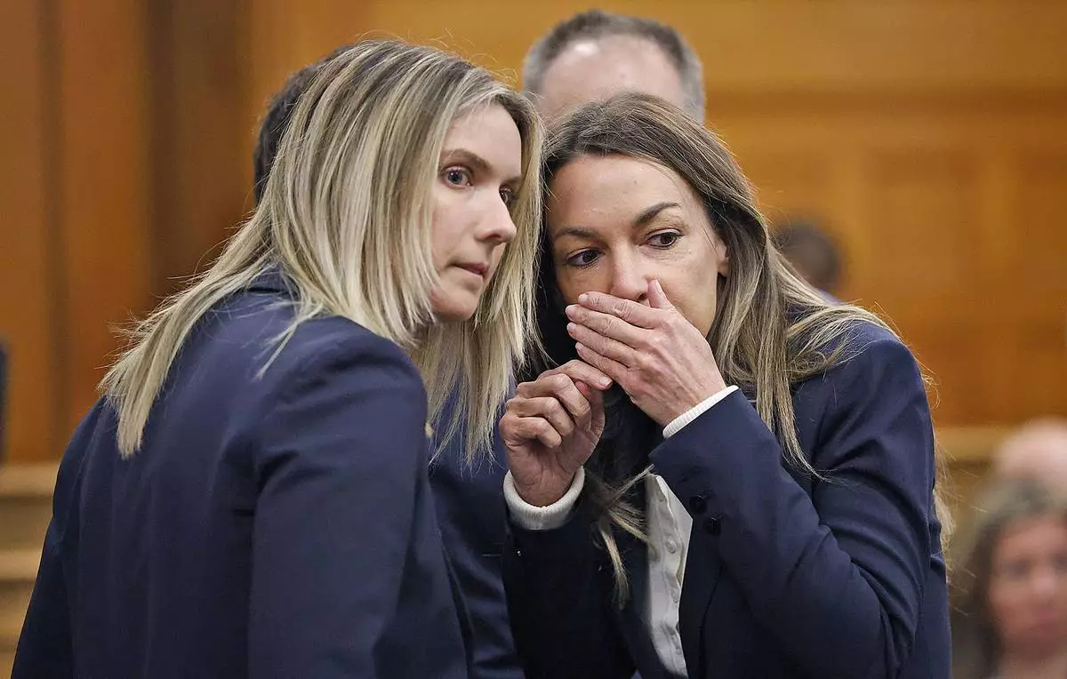 Defendant Karen Read, center, and defense lawyer David Yannetti, right, listen as Massachusetts State Police Sgt. Yuriy Bukhenik testifieds during the Karen Read murder trial in Norfolk Superior Court in Dedham, Mass., Friday, May 9, 2025. (Mark Stockwell/The Sun Chronicle via AP, Pool)