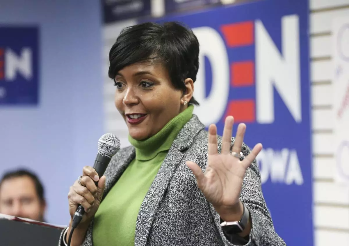 FILE - In this Jan. 10, 2020, file photo, Atlanta Mayor Keisha Lance Bottoms speaks in Cedar Rapids, Iowa. (Rebecca F. Miller/The Gazette via AP, File)