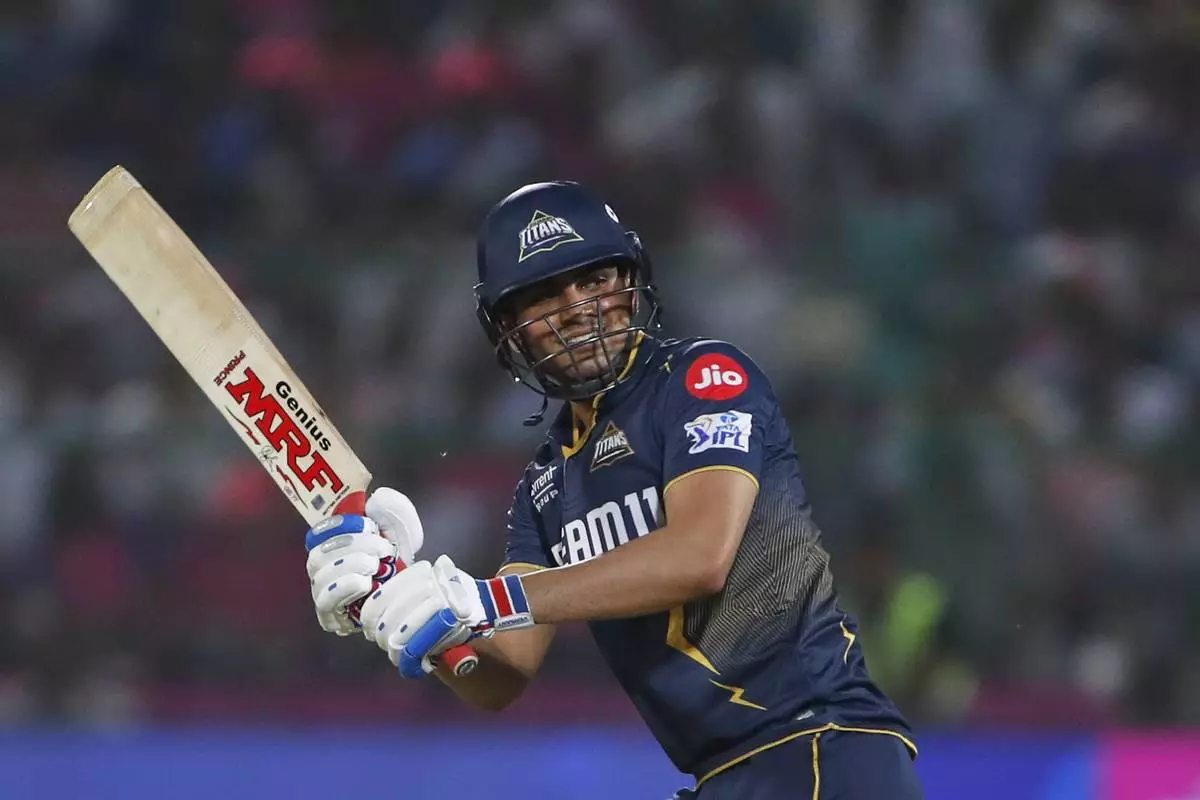 Gujarat Titans' captain Shubman Gill bats during the Indian Premier League cricket match between Rajasthan Royals and Gujarat Titans at Sawai Mansingh Stadium in Jaipur, India, Monday, April 28, 2025. (AP Photo/Surjeet Yadav)