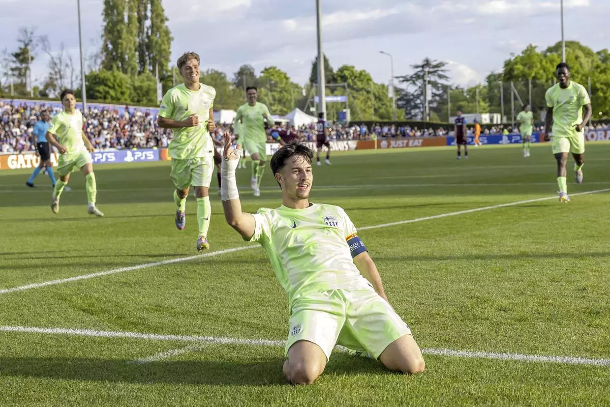 Barcelona's captain forward Hugo Alba celebrates after scoring, during the UEFA Youth League Final match between Trabzonspor and Barcelona, at the Colovray Sports Centre in Nyon, Switzerland, Monday, April 28, 2025. (Salvatore Di Nolfi/Keystone via AP)