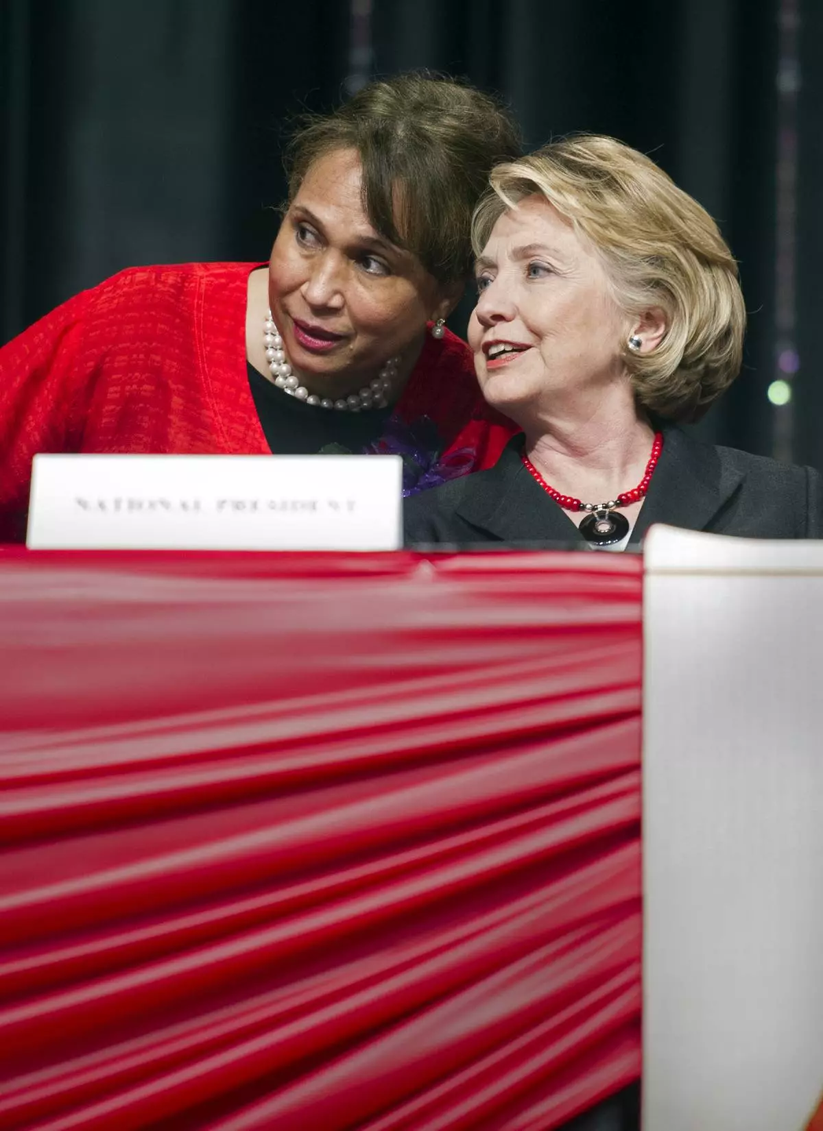 FILE - Former Secretary of State Hillary Rodham Clinton talks with former Labor Secretary Alexis Herman prior to addressing the 51st Delta Sigma Theta National Convention in Washington, July 16, 2013. (AP Photo/Cliff Owen, file)