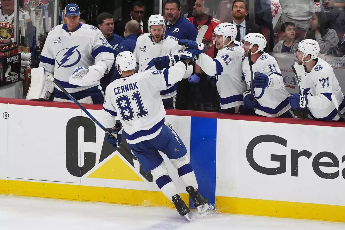 Tampa Bay Lightning defenseman Erik Cernak (81) celebrates his goal with teammates during the second period in Game 4 of an NHL hockey Stanley Cup first-round playoff series against the Florida Panthers, Monday, April 28, 2025, in Sunrise, Fla. (AP Photo/Marta Lavandier)