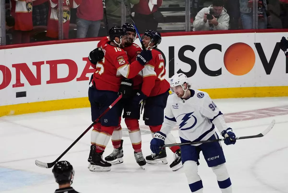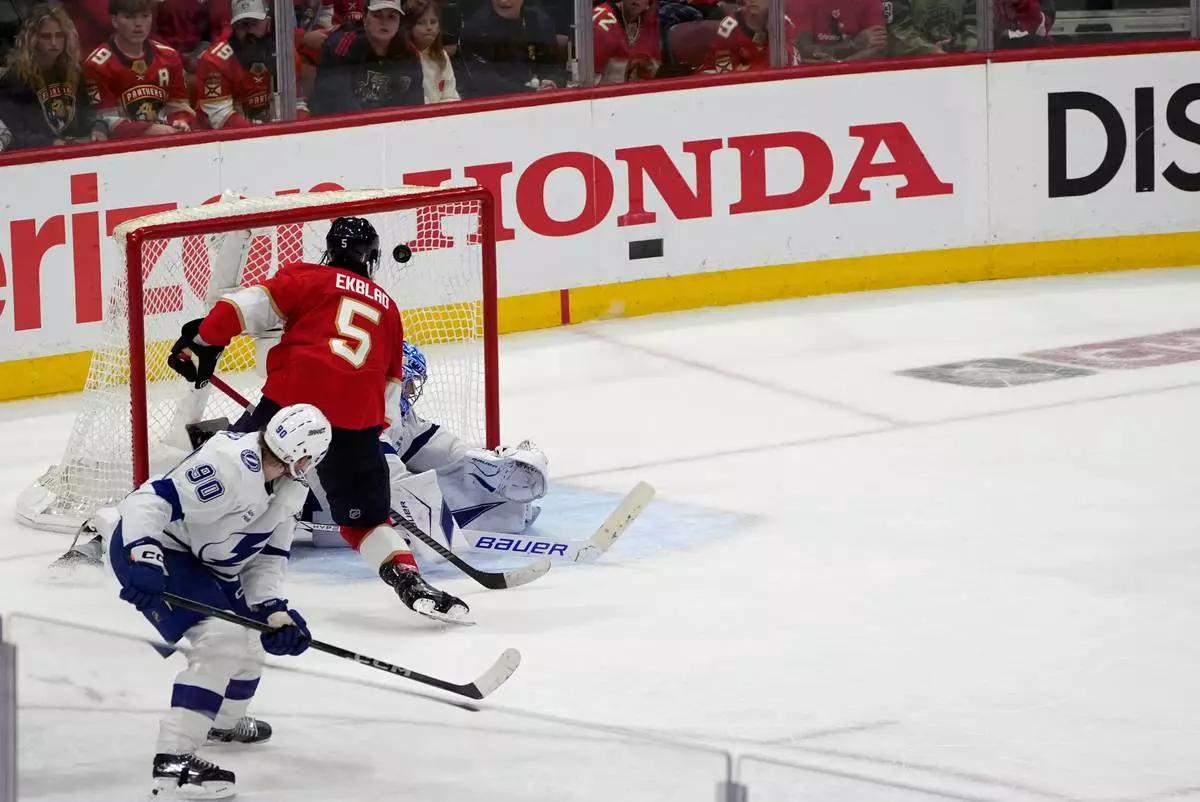 Ekblad had a tying goal overturned in the third after a successful challenge by the Lightning for offside, which kept the score at 2-1 before the defenseman, in just his second game back from a 20-game suspension, picked up a rebound and put it past Vasilevskiy.