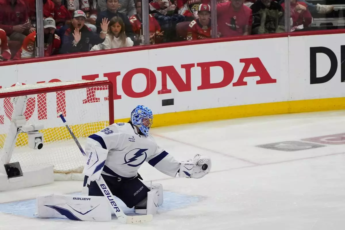 Tampa Bay Lightning goaltender Andrei Vasilevskiy (88) stops a shot on goal during the first period in Game 4 of an NHL hockey Stanley Cup first-round playoff series against the Florida Panthers, Monday, April 28, 2025, in Sunrise, Fla. (AP Photo/Marta Lavandier)