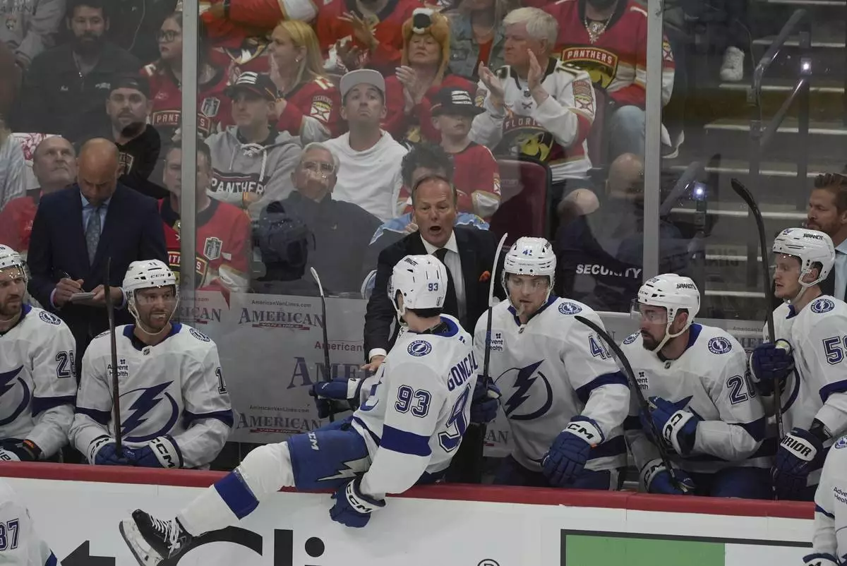 Tampa Bay Lightning head coach Jon Cooper gets center Gage Goncalves (93) on the ice during the first period in Game 4 of an NHL hockey Stanley Cup first-round playoff series against the Florida Panthers, Monday, April 28, 2025, in Sunrise, Fla. (AP Photo/Marta Lavandier)