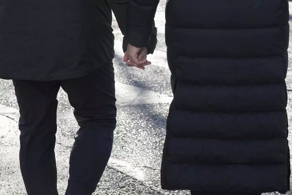 FILE - A couple holds hands while crossing the street during a cold morning in Beijing, China on Friday, Jan. 10, 2025. (AP Photo/Aaron Favila, File)