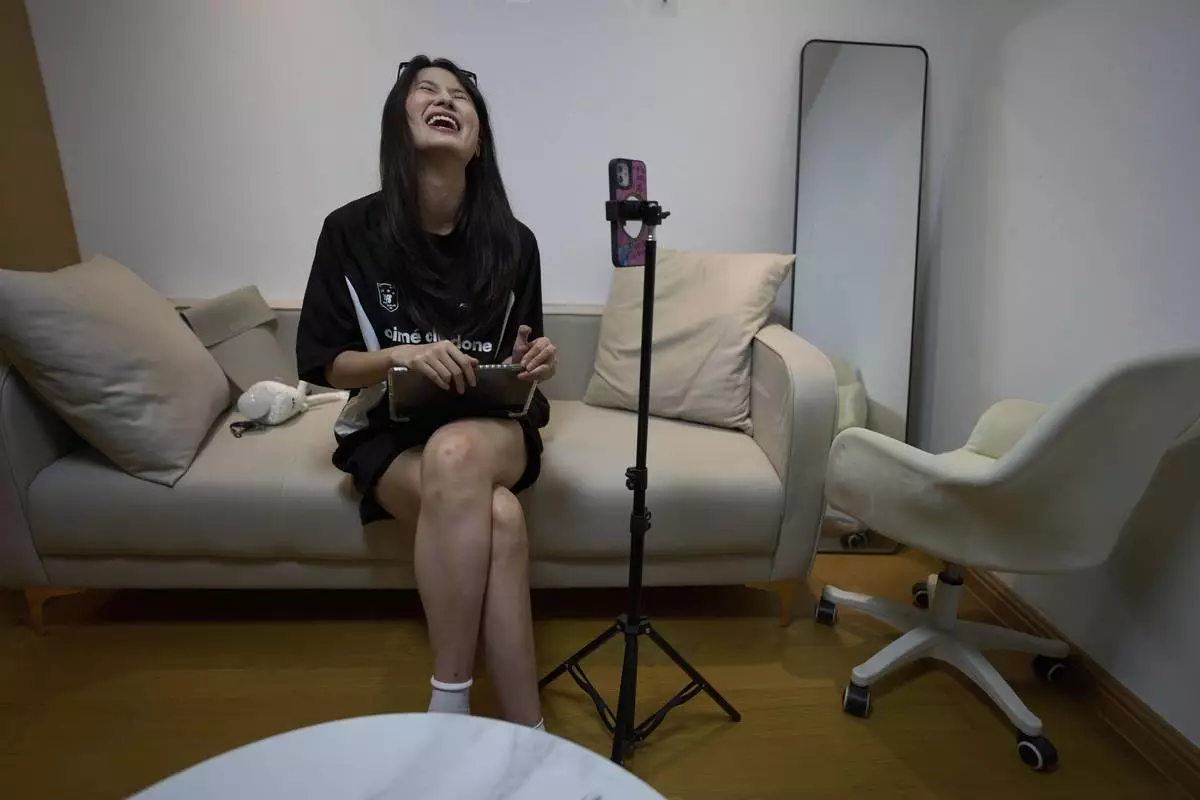 Tian Xin, a cyber matchmaker, hosts a livestream using the Chinese social media app Xiaohongshu (RedNote) from Hangzhou, China, early Friday, April 25, 2025. (AP Photo/Ng Han Guan)