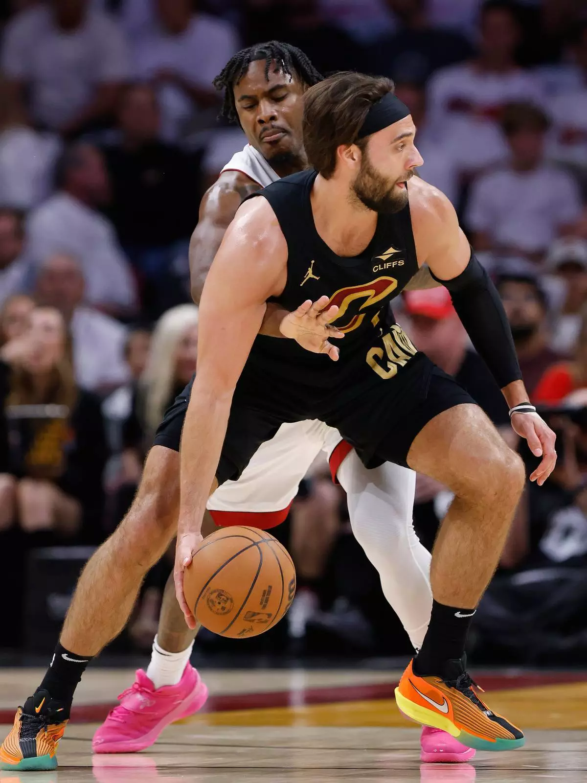 Miami Heat guard Davion Mitchell, back, tries to knock the ball away from Cleveland Cavaliers guard Max Strus, front, during the first half in Game 4 of an NBA basketball first-round playoff series, Monday, April 28, 2025, in Miami. (AP Photo/Rhona Wise)