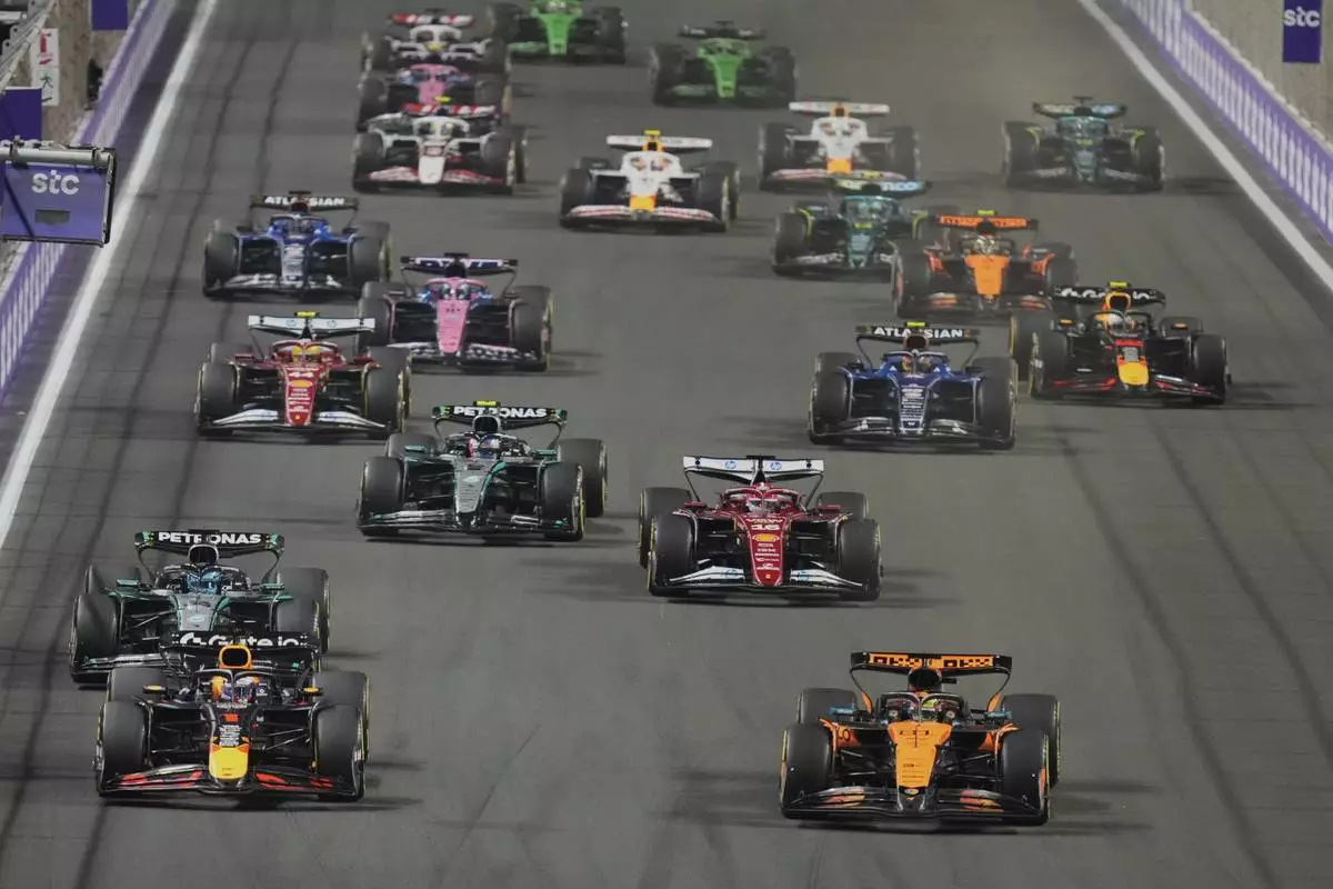 Red Bull driver Max Verstappen of the Netherlands, left, steers his car followed by McLaren driver Oscar Piastri of Australia during the Formula One Saudi Arabian Grand Prix at the Jeddah Corniche Circuit in Jeddah, Saudi Arabia, Sunday, April 20, 2025. (AP Photo/Darko Bandic)