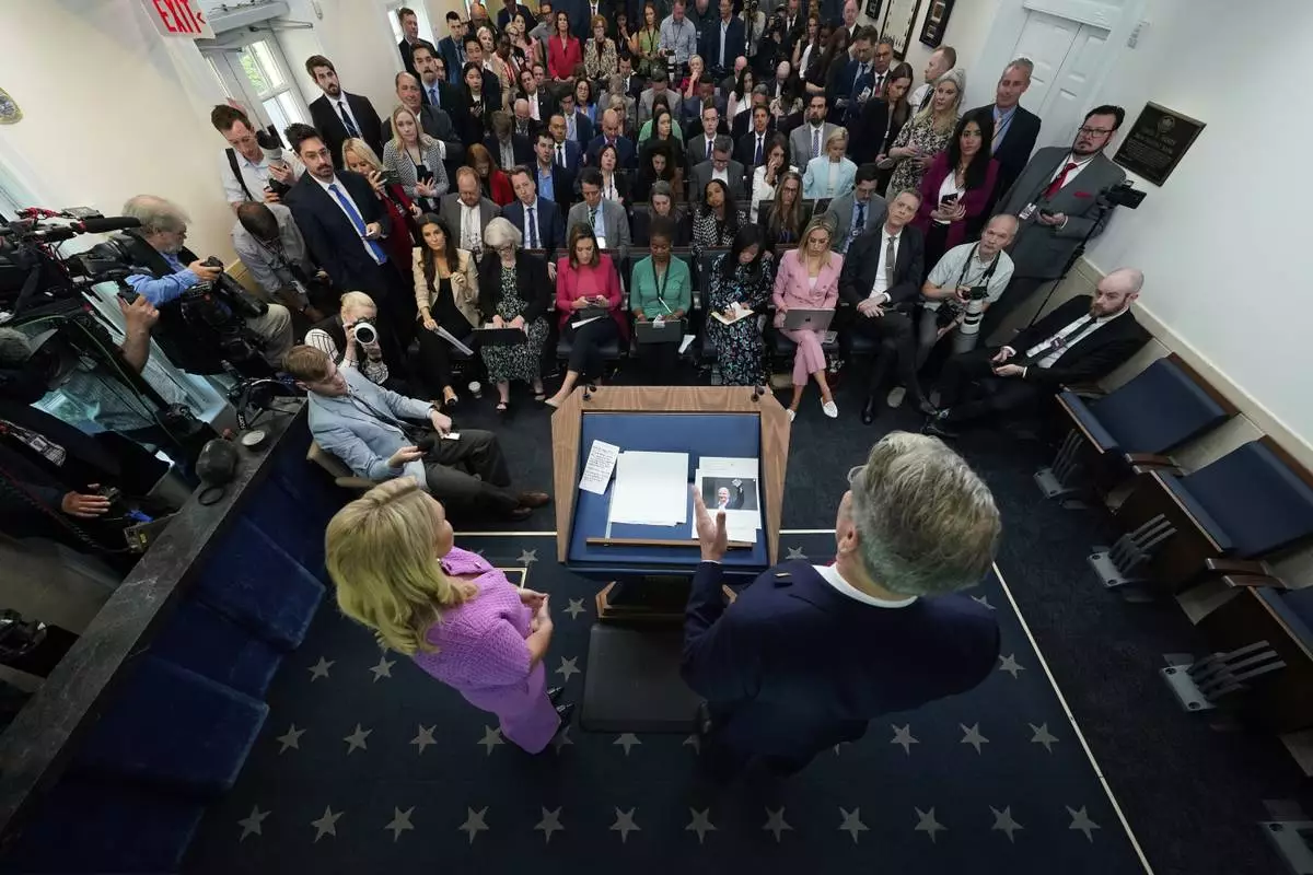 White House press secretary Karoline Leavitt speaks during a briefing with Treasury Secretary Scott Bessent at the White House, Tuesday, April 29, 2025, in Washington. (AP Photo/Evan Vucci)