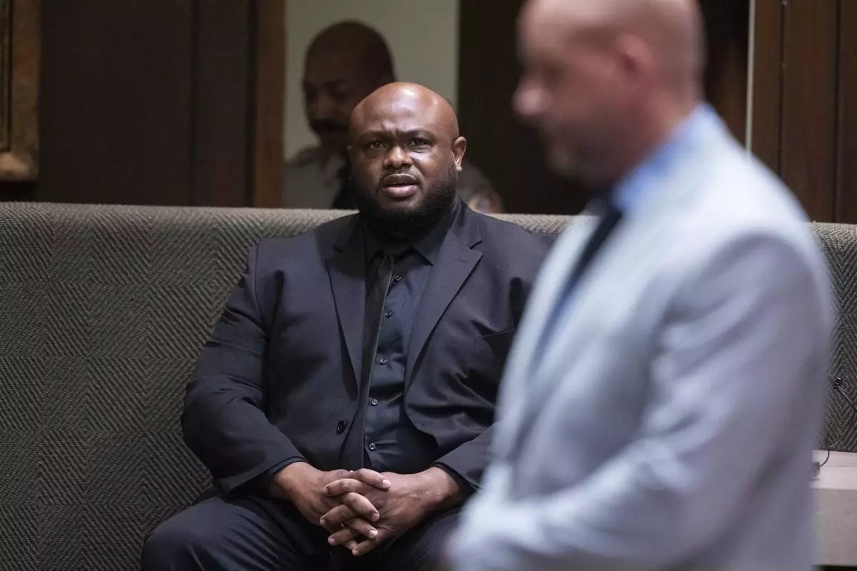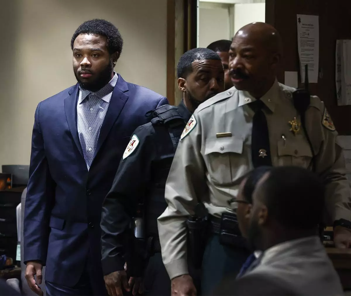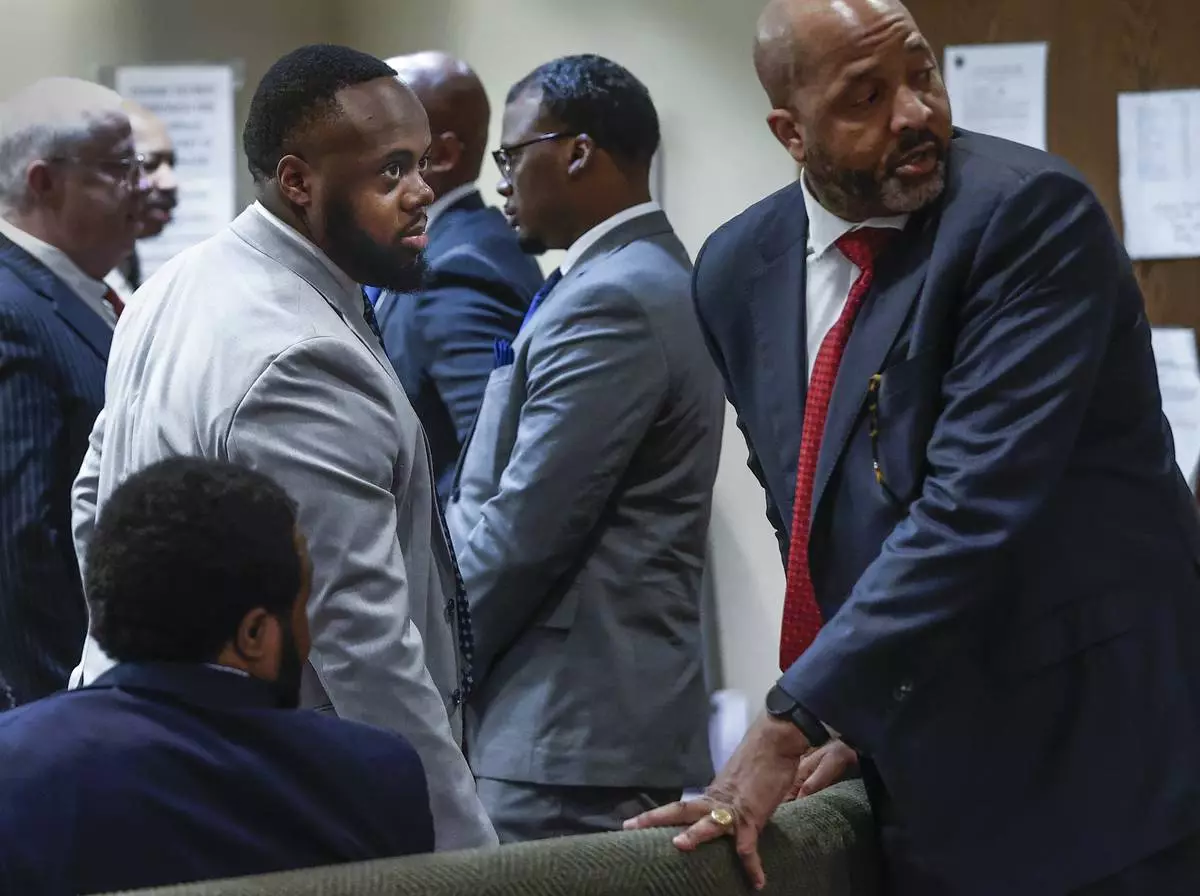 Former Memphis Police officer Tadarrius Bean, left, appears in a Shelby County courtroom on Monday, April 28, 2025, to stand trial for second-degree murder in the beating death of Tyre Nichols after a 2023 traffic stop in Memphis. (Mark Weber/Daily Memphian via AP, Pool)