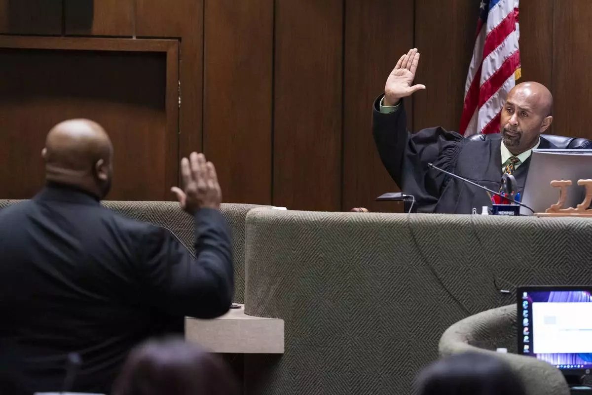 Desmond Mills Jr., a former Memphis Police Department officer who has taken a plea deal, left, is sworn in by Judge James Jones Jr., right, as a witness during the second day of the state trial for the death of Tyre Nichols at 201 Poplar in Memphis, Tenn., on Tuesday, April 29, 2025. (Chris Day/Commercial Appeal/USA Today Network via AP, Pool)