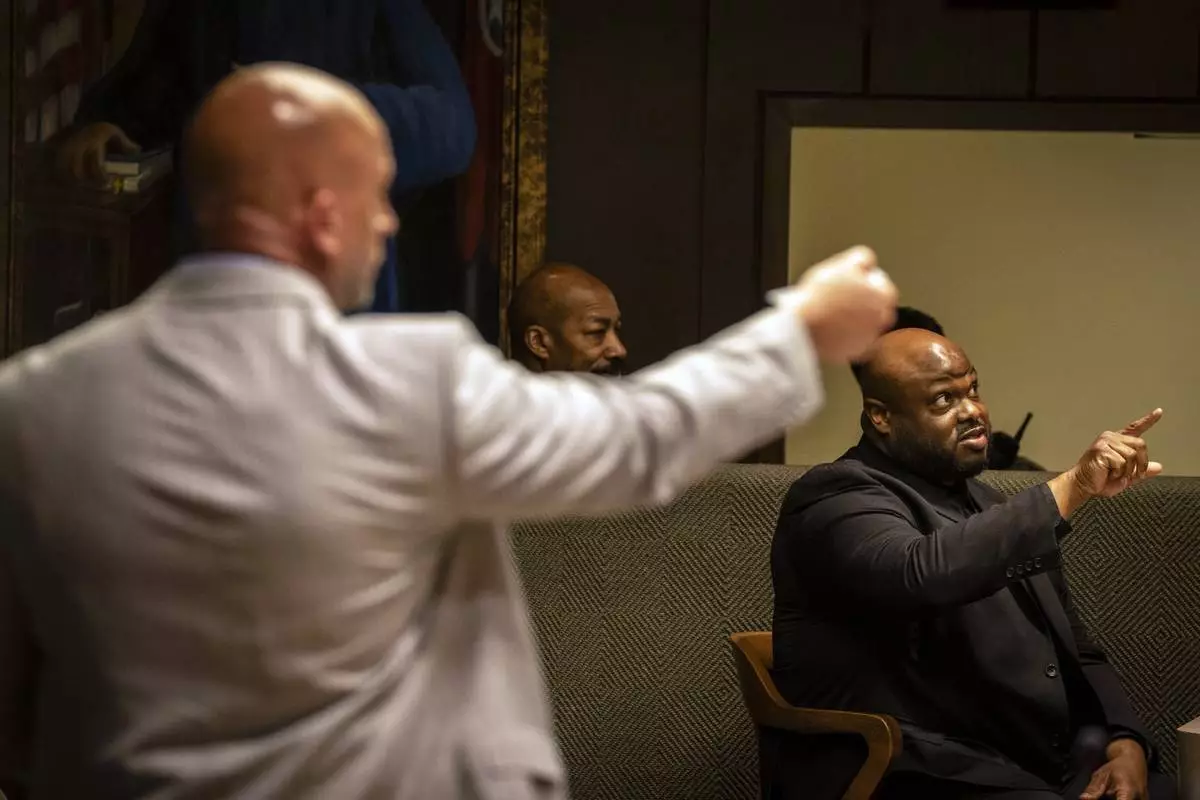 Desmond Mills Jr., a former Memphis Police Department officer who has taken a plea deal, second from left, identifies officers in body camera footage of the traffic stop of Tyre Nichols during the second day of the state trial for the death of Nichols at 201 Poplar in Memphis, Tenn., on Tuesday, April 29, 2025. (Chris Day/Commercial Appeal/USA Today Network via AP, Pool)