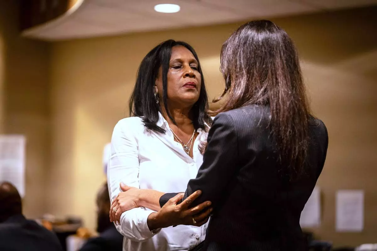 RowVaughn Wells, mother of Tyre Nichols, left, is embraced by a community member while entering the courtroom Tuesday, April 29, 2025, during the second day of a trial against former Memphis police officers accused of fatally beating her son in a 2023 traffic stop in Memphis, Tenn. (Andrea Morales for MLK50 via AP, Pool)