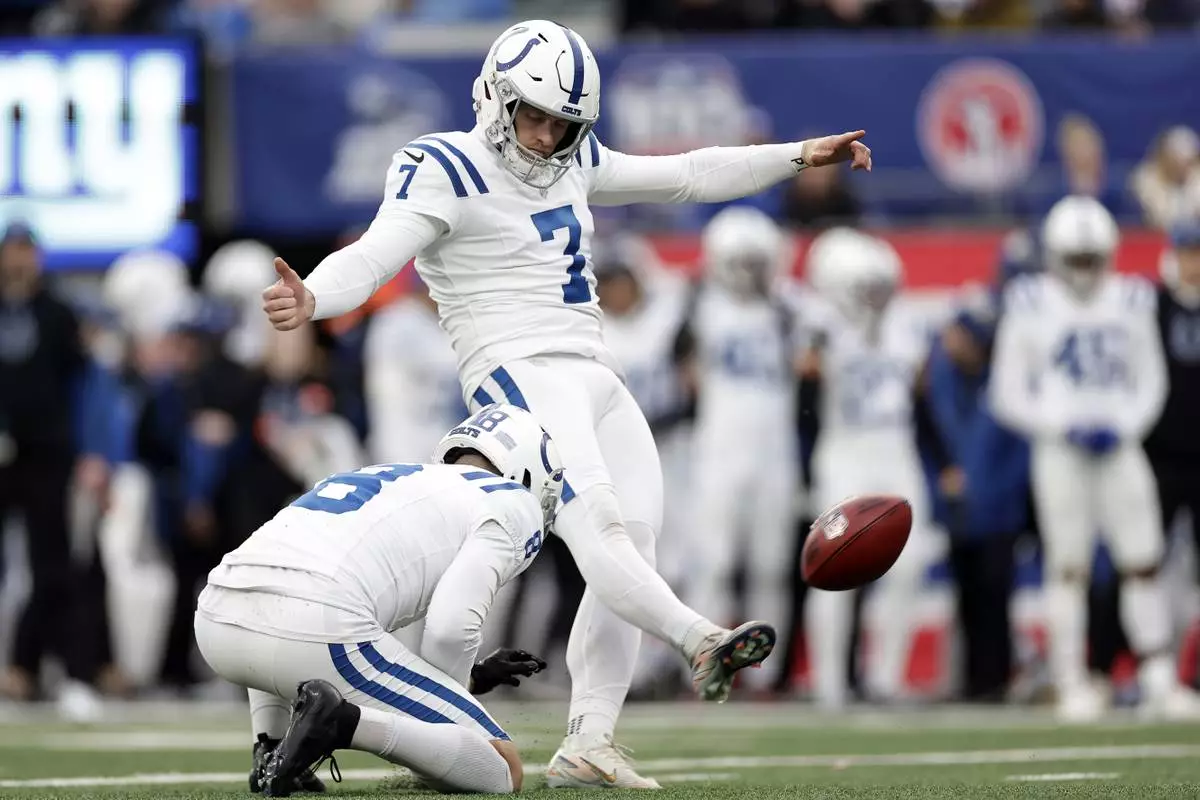 FILE - Indianapolis Colts place kicker Matt Gay (7) kicks during an NFL football game against the New York Giants Sunday, Dec. 29, 2024, in East Rutherford, N.J. (AP Photo/Adam Hunger, File)