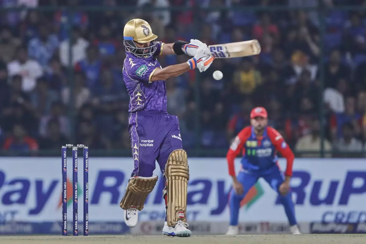 Kolkata Knight Riders' captain Ajinkya Rahane plays a shot during the Indian Premier League cricket match between Delhi Capitals and Kolkata Knight Riders at Arun Jaitley Stadium in New Delhi, India, Tuesday, April 29, 2025. (AP Photo)