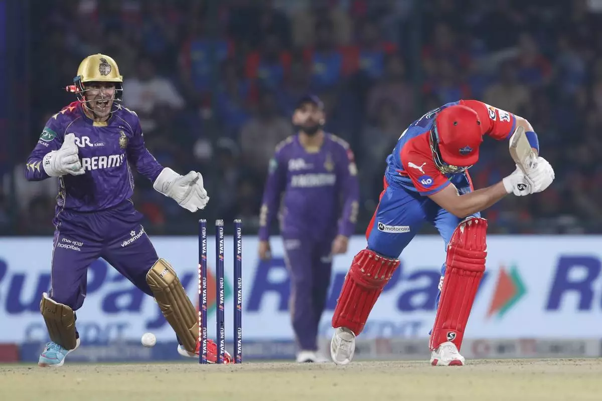 Delhi Capitals' Tristan Stubbs, right, is bowled out by Kolkata Knight Riders' Sunil Narine during the Indian Premier League cricket match between Delhi Capitals and Kolkata Knight Riders at Arun Jaitley Stadium in New Delhi, India, Tuesday, April 29, 2025. (AP Photo)