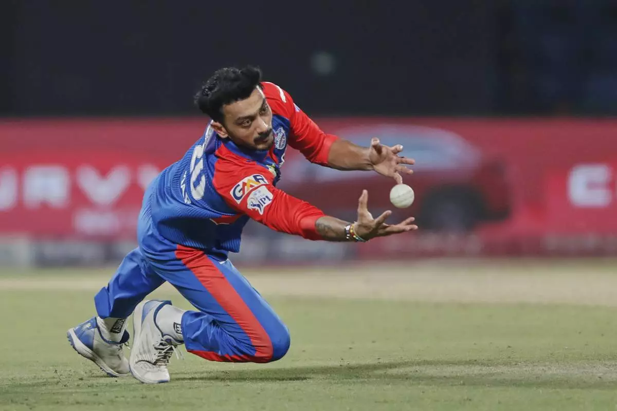 Delhi Capitals' captain Axar Patel drops the catch of Kolkata Knight Riders' Angkrish Raghuvanshi during the Indian Premier League cricket match between Delhi Capitals and Kolkata Knight Riders at Arun Jaitley Stadium in New Delhi, India, Tuesday, April 29, 2025. (AP Photo)