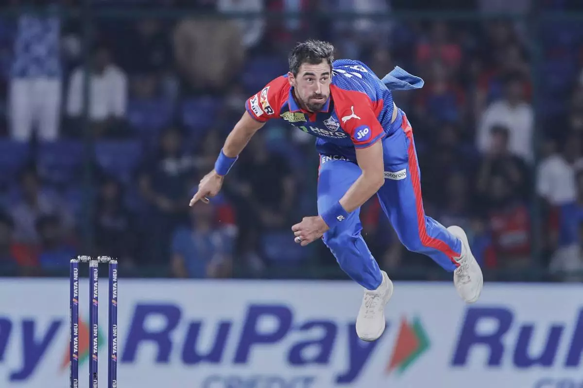 Delhi Capitals' Mitchell Starc bowls a delivery during the Indian Premier League cricket match between Delhi Capitals and Kolkata Knight Riders at Arun Jaitley Stadium in New Delhi, India, Tuesday, April 29, 2025. (AP Photo)
