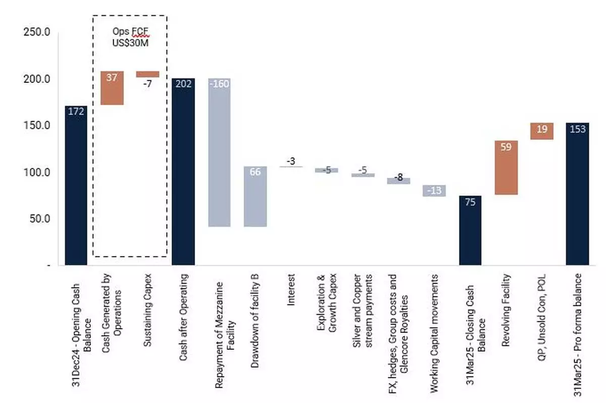 There were ~US$21.7 million of cash received for copper concentrate sold to Glencore on 25 March 2025 for which we received the cash with revenue to be accounted for early April 2025. The unaudited cash position also reflects ~US$2.5 million in interest payments for the newly refinanced Senior facility.