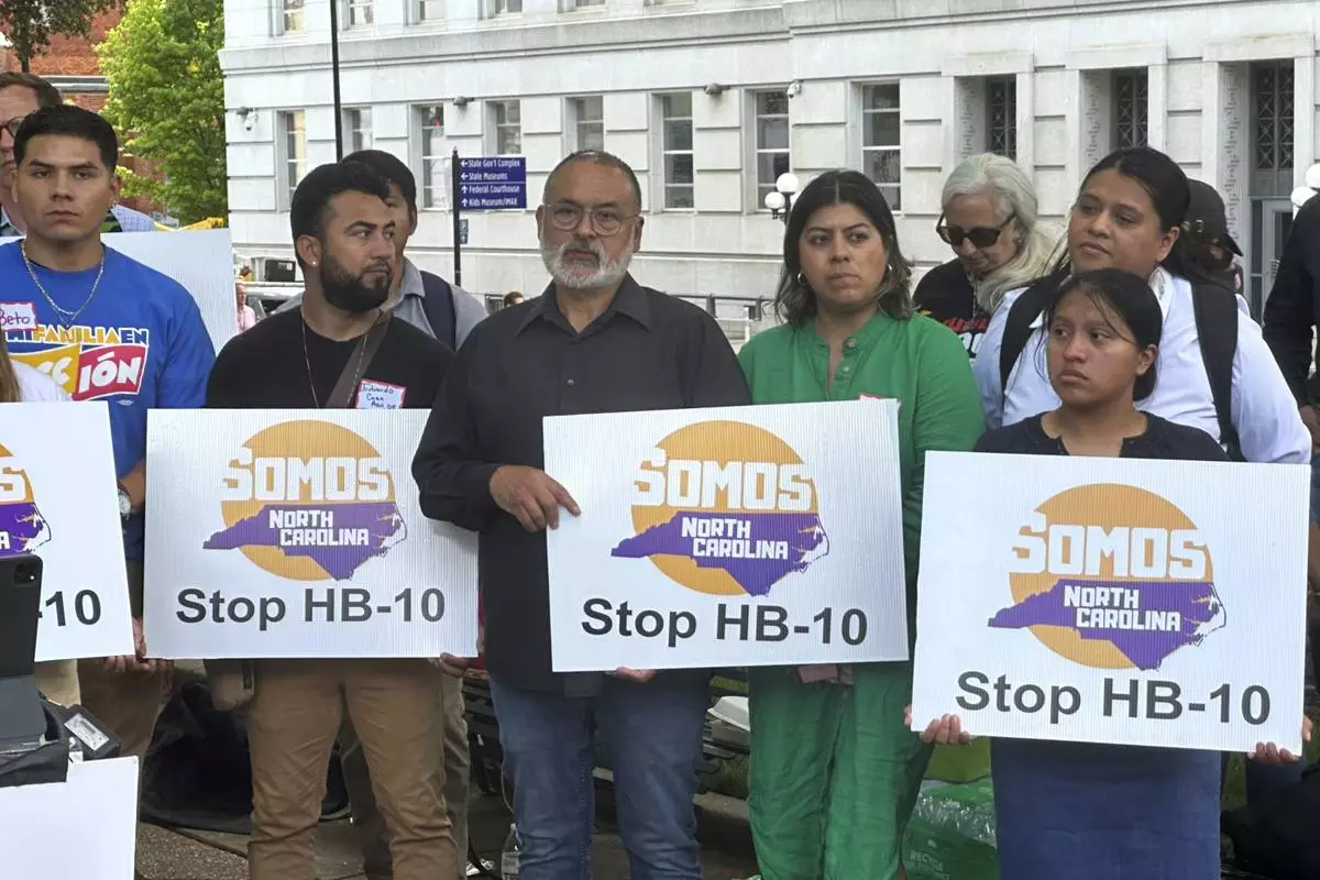 FILE - Opponents of a measure debated by the North Carolina General Assembly that would force local sheriffs to comply with requests by federal agents interested in picking up jail inmates believed to be in the country illegally hold placards against the bill during a rally on May 1, 2024, outside the old Capitol Building in Raleigh, N.C. (AP Photo/Gary D. Robertson, File)