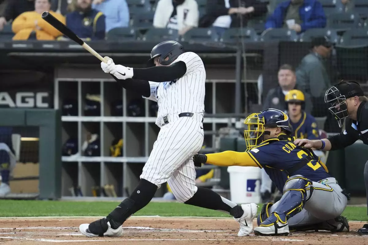 Chicago White Sox's Andrew Vaughn hits a single during the first inning of a baseball game against the Milwaukee Brewers in Chicago, Tuesday, April 29, 2025. (AP Photo/Nam Y. Huh)