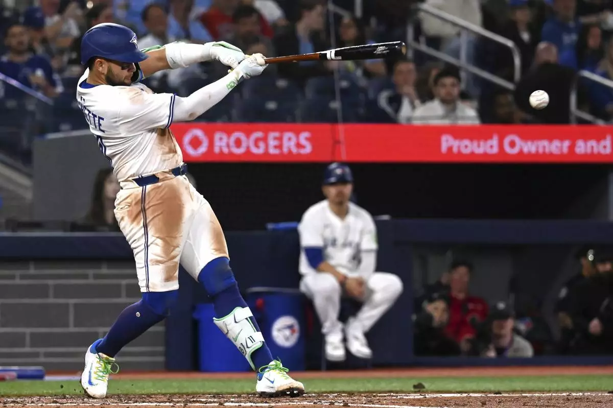 Toronto Blue Jays' Bo Bichette (11) hits a double against the Boston Red Sox in the third inning of a baseball game in Toronto on Tuesday, April 29, 2025. (Jon Blacker/The Canadian Press via AP)