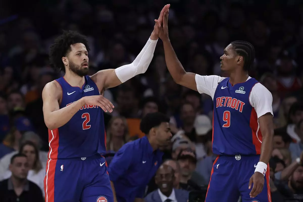 Detroit Pistons guard Cade Cunningham (2) celebrates with Ausar Thompson in the second half during Game 5 in an NBA basketball first-round playoff series against the New York Knicks, Tuesday, April 29, 2025, in New York. (AP Photo/Adam Hunger)