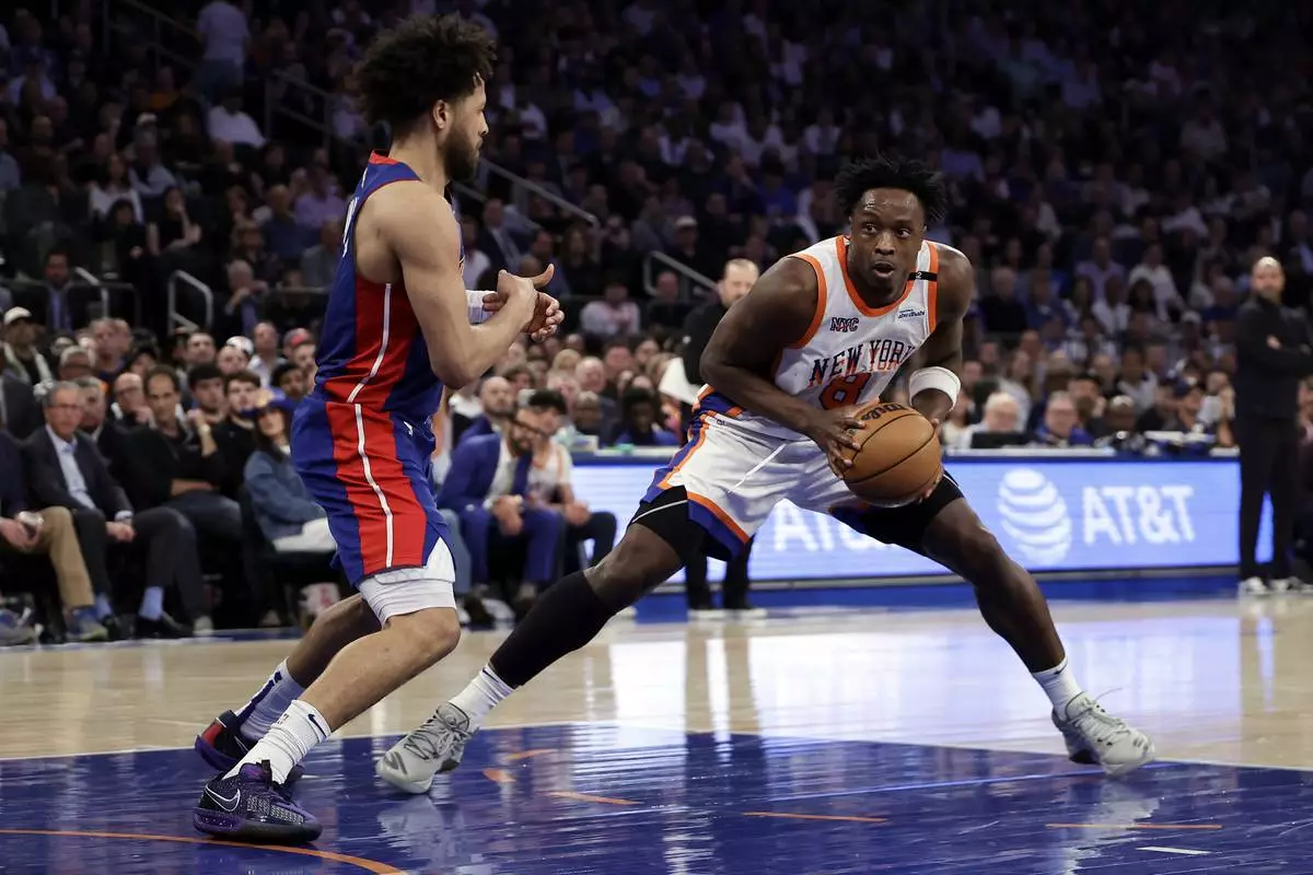 New York Knicks forward OG Anunoby (8) drives to the basket past Detroit Pistons guard Cade Cunningham during Game 5 in an NBA basketball first-round playoff series Tuesday, April 29, 2025, in New York. (AP Photo/Adam Hunger)