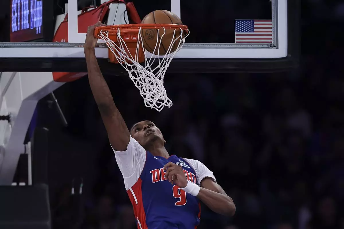 Detroit Pistons forward Ausar Thompson (9) dunks the ball in the second half during Game 5 in an NBA basketball first-round playoff series against the New York Knicks, Tuesday, April 29, 2025, in New York. (AP Photo/Adam Hunger)