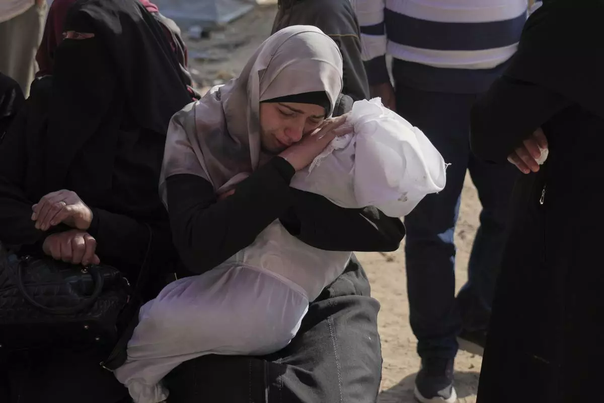 Heba Shakura mourns her son Islam Abu Mahdi who was killed in an Israeli army airstrike, during his funeral at the Indonesian hospital in Beit Lahia, northern Gaza Strip, Monday, April 28, 2025. (AP Photo/Jehad Alshrafi)