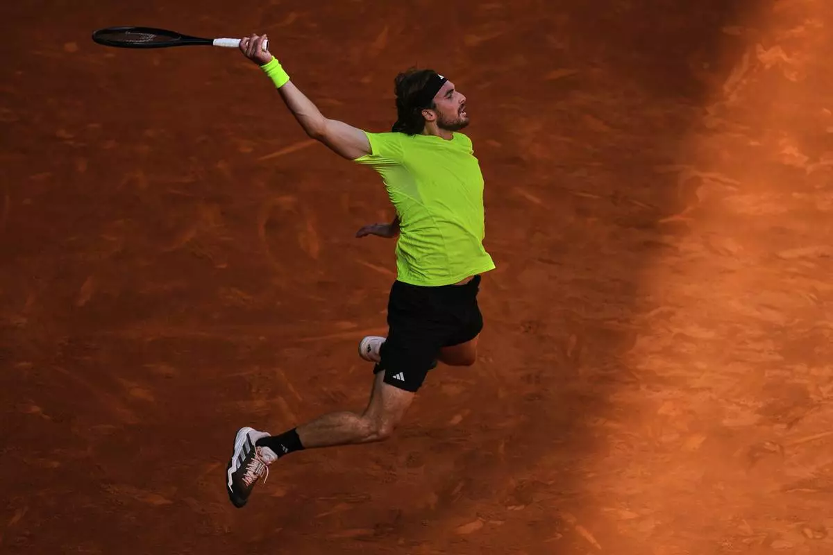 Stefanos Tsitsipas of Greece returns the ball against Lorenzo Musetti of Italy during the Madrid Open round of 32 tennis match in Madrid, Spain, Tuesday, April 29, 2025. (AP Photo/Manu Fernandez)